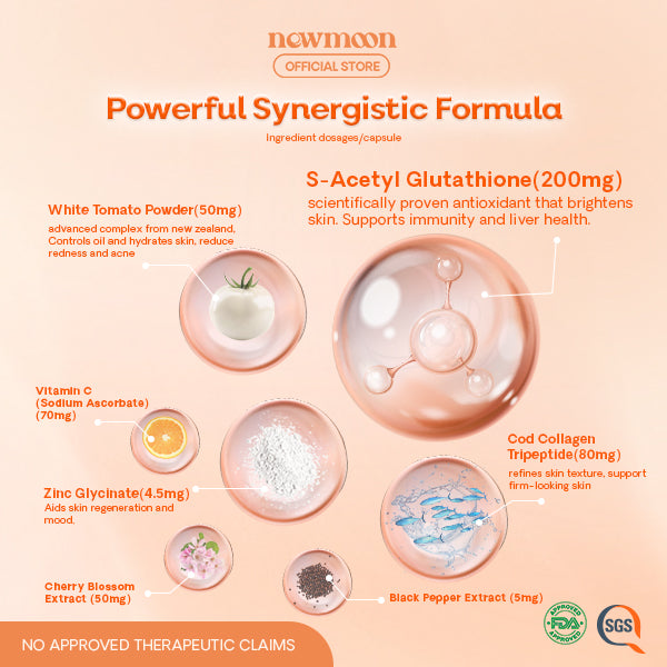 - White Tomato Powder, Sodium Ascorbate (Vitamin C), Tripeptide Collagen, Sakura (Cherry Blossom) Extract, Zinc Glycinate, Black Pepper Extract